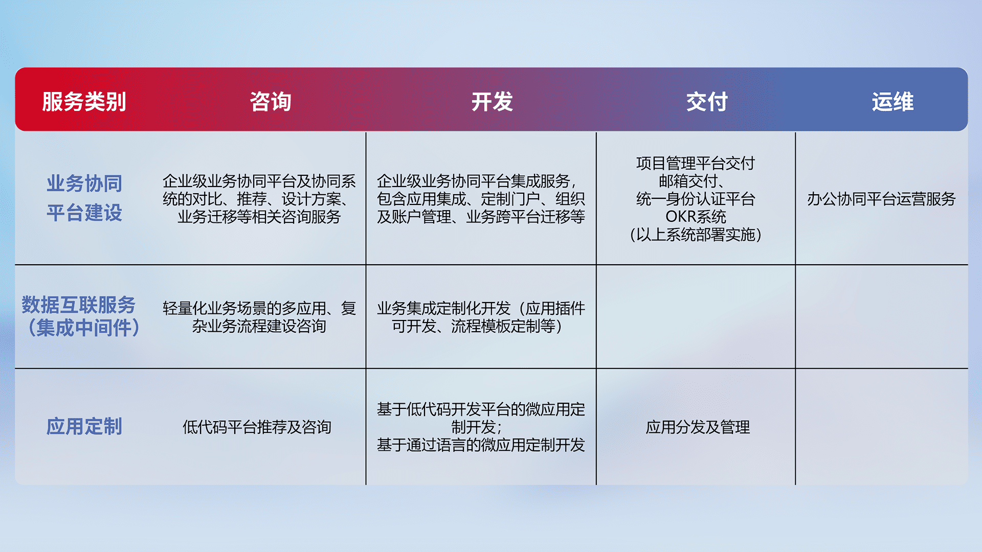 针对钉钉、、、、企微、、、IDaas等平台级产品提供产品的规划、、、、方案、、、交付、、、定制化开发等服务,,,实现如统一协同办公、、智能客户服务、、、混合会议管理、、、智能数据查询、、等业务场景,,,实现数字化转型。。。。